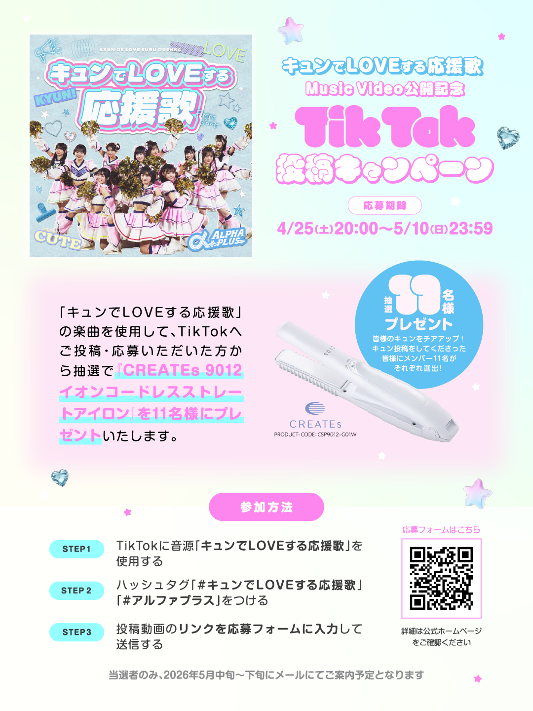 『キュンでLOVEする応援歌』の楽曲を使用して、TikTokへご投稿・応募いただいた方から抽選で、いつでも「360度カワイイ」が叶う、「9012 イオンコードレス ストレートアイロン」を11名様にプレゼント!