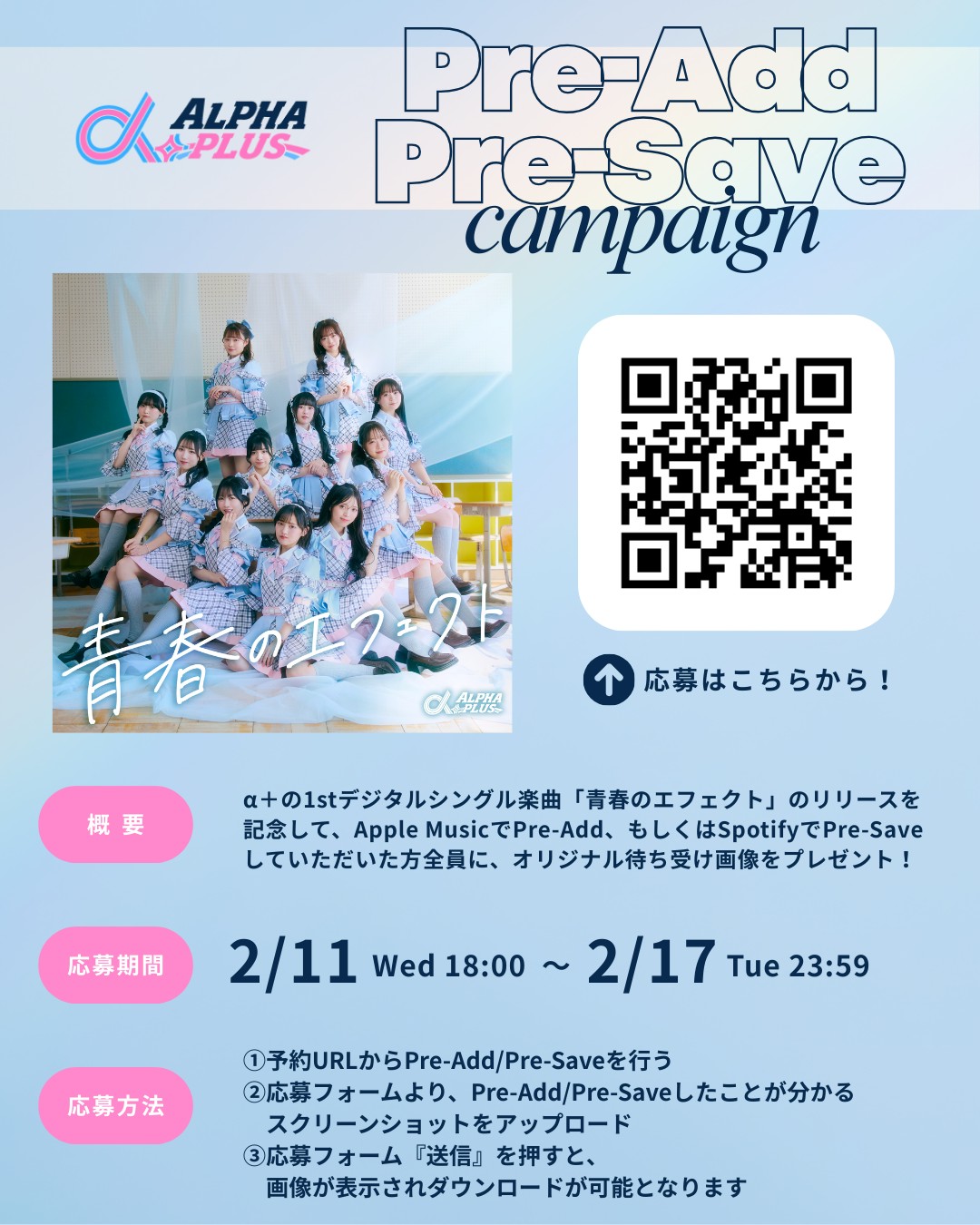 2/18(水)より配信スタートするα+「青春のエフェクト」をApple MusicにてPre-Add、SpotifyにてPre-Saveされた方全員を対象としたデジタルキャンペーン開催が決定!